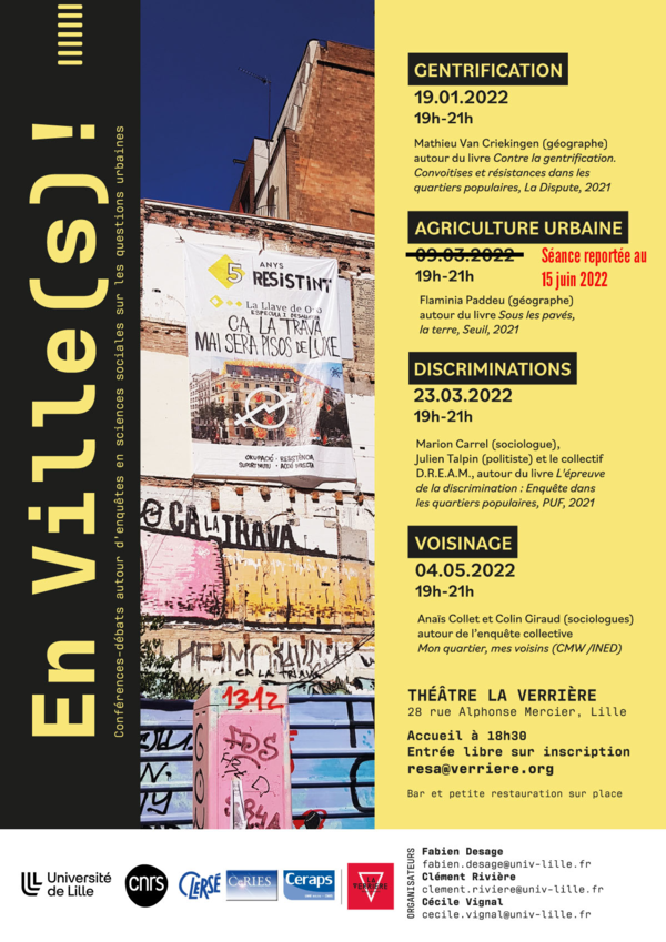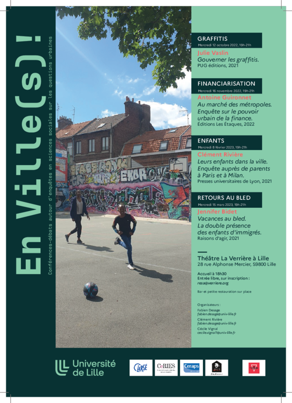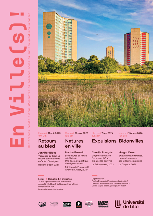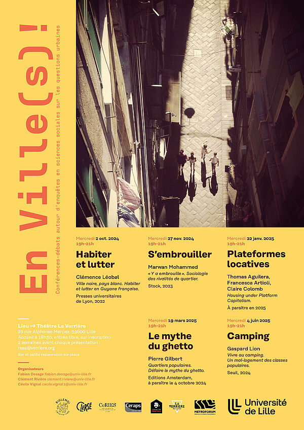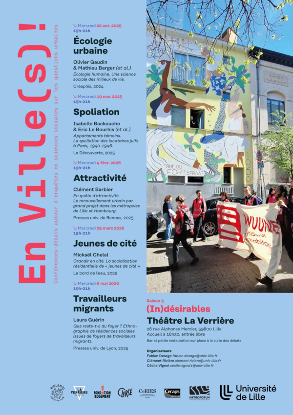 Lancé en 2022, ce séminaire "En Ville(s)!" se donne pour objectif de permettre à un public large (habitants, professionnels de l'action publique, travailleurs sociaux, militants, étudiants, citoyens) de débattre avec des chercheurs autour d'enquêtes contemporaines de sciences sociales sur les questions urbaines. Le séminaire propose chaque année universitaire une nouvelle saison au cours de laquelle des chercheurs viennent présenter leur dernier ouvrage, toujours en lien avec l'objet du séminaire, s'en suit alors un débat avec le public présent.